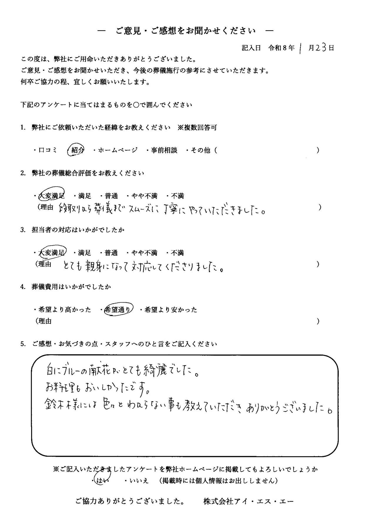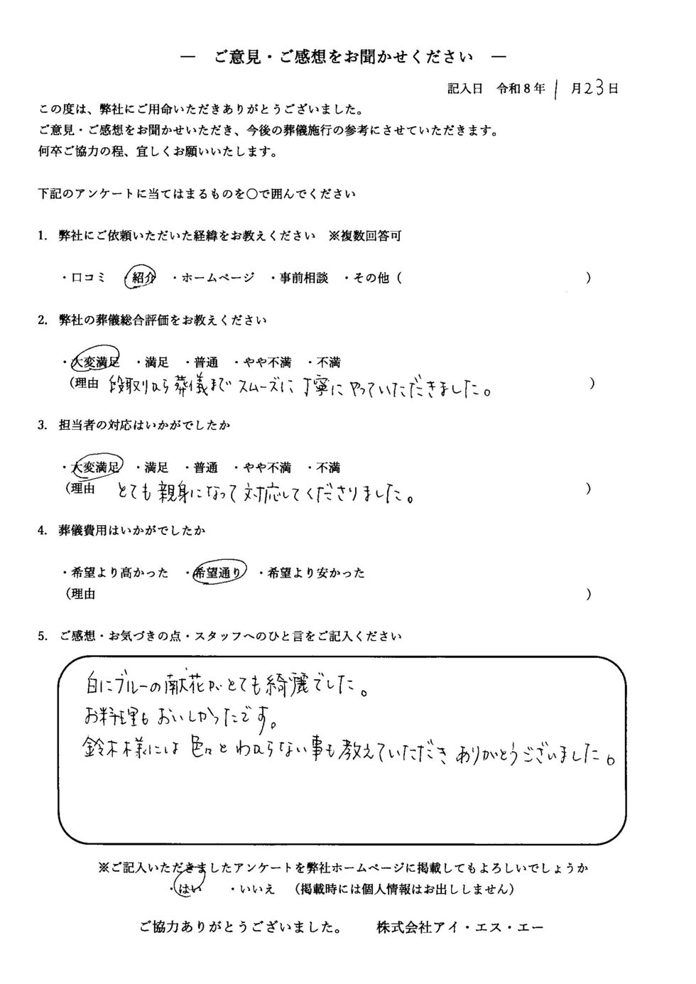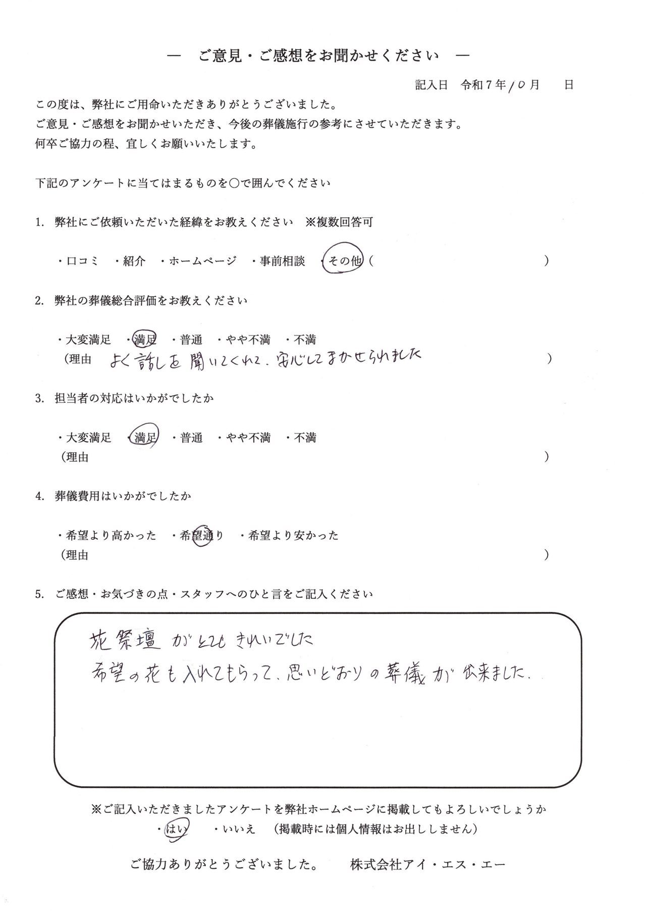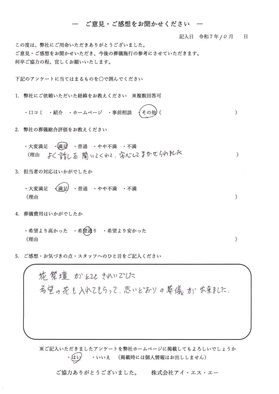 こちらではお客さまの声を紹介いたします。 皆様のご意見・ご感想をサービス向上のために参考にさせて頂きます。 アンケートにご協力頂き、心より御礼申し上げます。